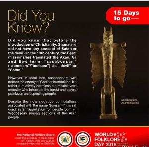 …and that the concept of the devil did not exist in ‘Ghanaian’ cultures before the arrival of Christianity. Sasabonsam was neither an enemy of God or mankind but a troublesome impish creature….I learnt these facts through the National Folklore Board when they launched their campaign in August 2018 promoting Ghanaian heritage.